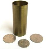 TUCHBÜCHSE Messing Eine entliehene Banknote kann gezeichnet werden und verschwindet auf unerklärlicher Weise aus der verschlossenen Büchse! Aus Messing mit Schraubverschluß. Länge ca. 6 cm, Durchmesser unten ca. 1.9 cm. Mit Schloß und Schlüssel! |