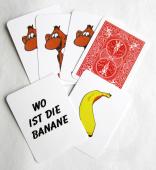 WO IST DIE BANANE ? (Jimmy Bix) Ein lustiges Spiel, bei dem es dem Zuschauer nicht gelingt, einer Bananen-Karte zu folgen, die zwischen Äffchen-Karten gemischt wird! Spezielle Kärtchen 8,5 x 6,5 cm mit Bicycle-Rückenmuster! |